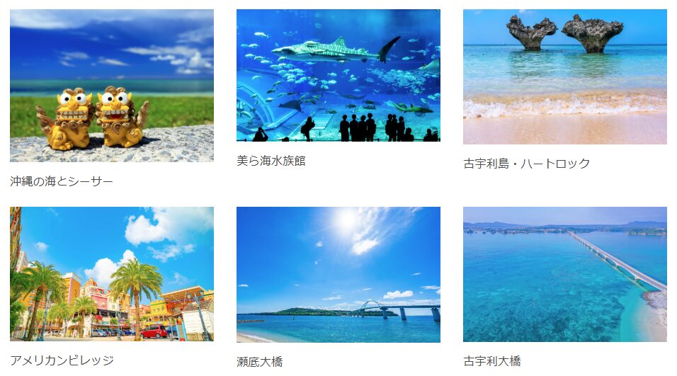 宿泊場所は、那覇市内・恩納村・名護・本部町・宜野湾・北谷町・国頭村・うるま・豊見城・読谷など、リゾートエリアの人気ホテルから選べます。