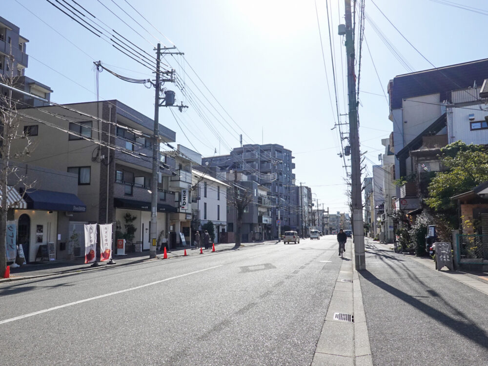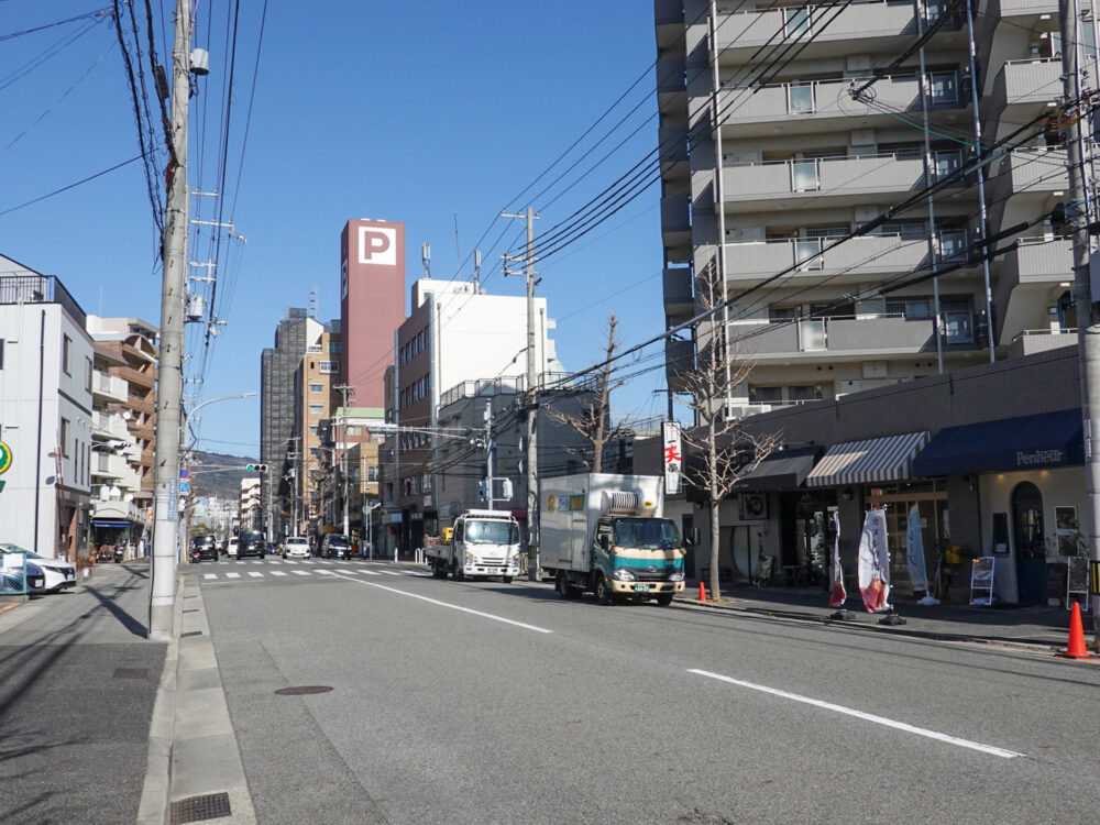 東側は、JR六甲道駅の方向。近くには、行列のできることもある「鶏白湯ラーメンMUTSUKI」ってラーメン屋さんがあるあたりです。