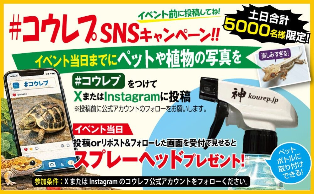 SNSキャンペーンも開催。InstagramまたはXで「コウレプ」の公式アカウントをフォローしてから「#コウレプ」を付けてペット(犬、猫を除く)の写真を投稿、会場スタッフに投稿画面とフォロー画面を提示すると、先着でスプレーヘッドがもらえます。