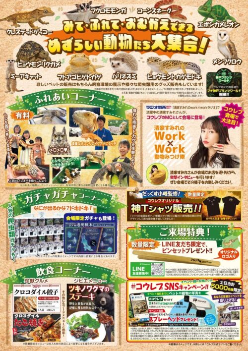 『コウレプ2026春』は、展示即売型の体験イベント。「見て」「触れて」「知って」「迎えられる」をテーマに、爬虫類を中心に多彩な動物たちに出会うことができます。