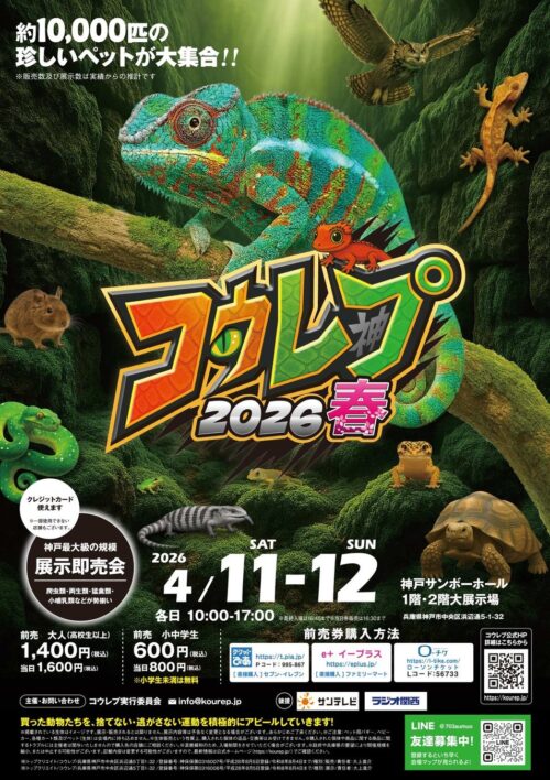 神戸サンボーホールで、神戸最大級の爬虫類イベント『コウレプ2026春』が開催されます。