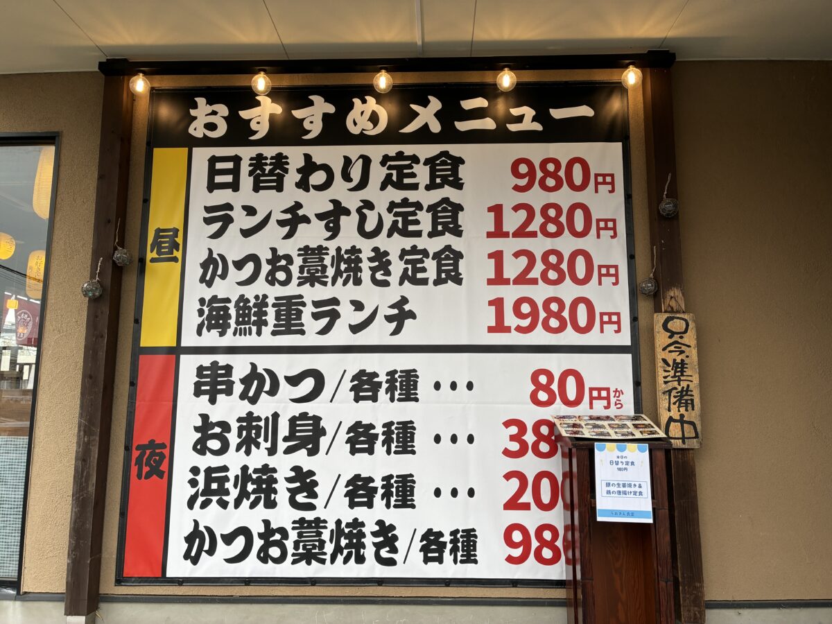 昼と夜で異なるメニュー展開をしていて、日替わり定食1,078円(税込)・寿司も88円~とリーズナブルなメニュー展開のようです。