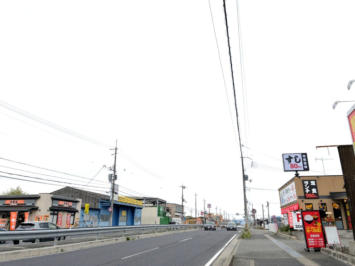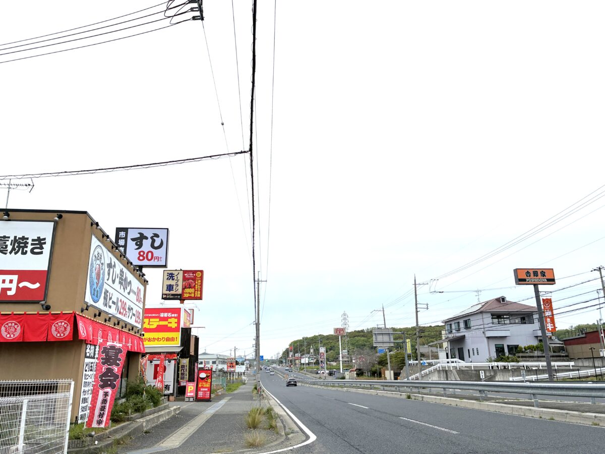 現在は駐車場を共有する形ですぐ並びには、「ワンダーステーキ」があり、道路を挟んだ向かい側には「吉野家」。さらに北へ進むと「餃子の王将」などもあります。