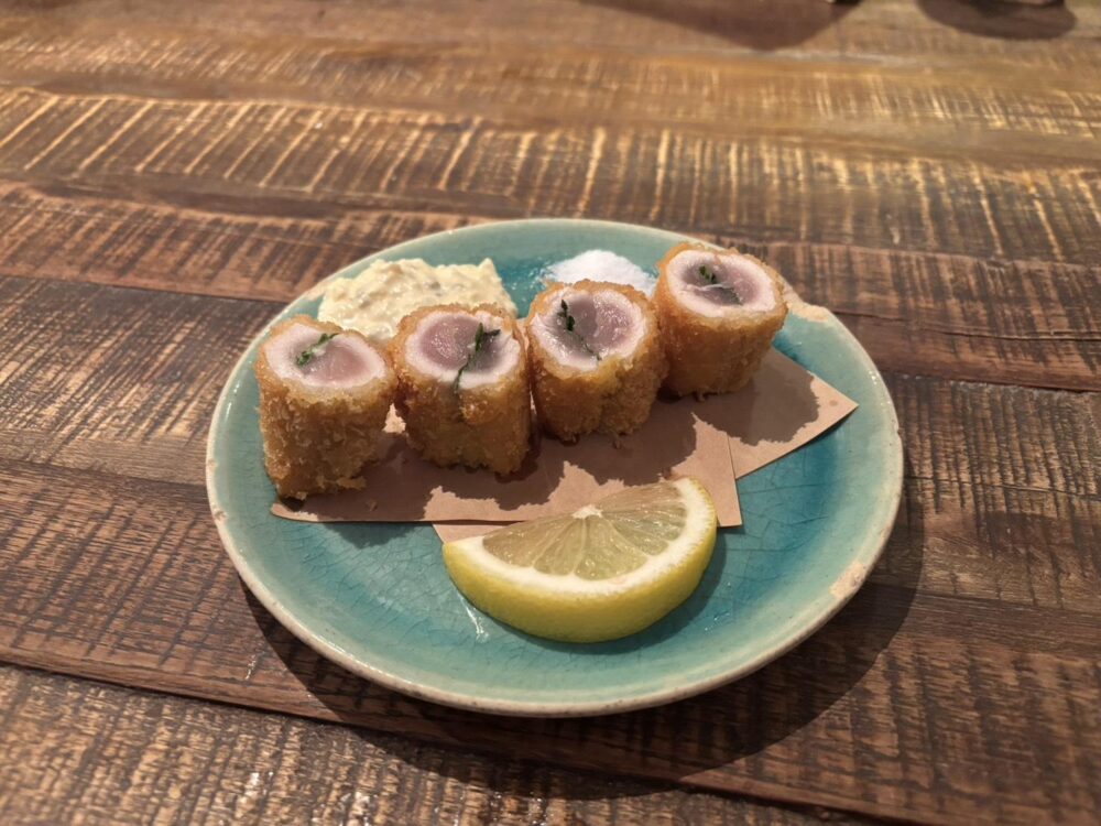 「ささみと大葉のレアカツ」一番売れているメニューなんだとか。大葉のアクセントが効いていて何個でも食べれちゃいます。味変でタルタルをつけるのもオススメ!