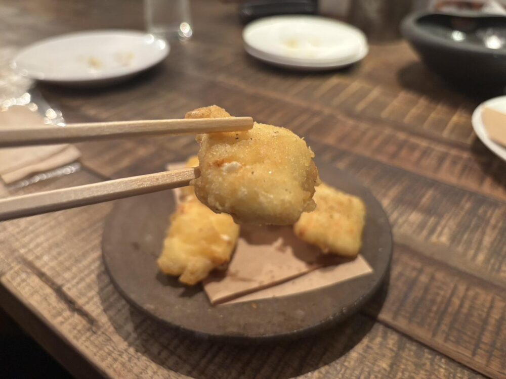 「クリームチーズの天ぷら」は、噛んだ瞬間クリームチーズが口の中でとろけてほのかな塩味がくせになり、こちらも何個でも食べれちゃいます。
