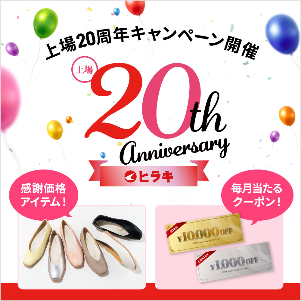 今回の『上場20周年記念キャンペーン』では、ヒラキオリジナルのスニーカー・フラットシューズなどが「感謝価格」で登場するほか、オンラインショップで使える「謝恩クーポン」のプレゼントなどが行われるみたい。