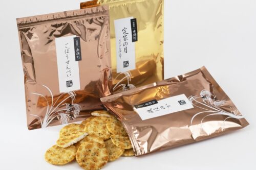 おせんべいの割れや欠けなどの選別工程を省き、たっぷり一袋に詰めたエコ商品です。感謝祭限定の無撰別おせんべいは、”定家の月 メイプル仕立て”、”あおさのりせんべい”、”ごぼうせんべい”の3種の味を用意。