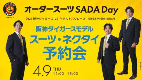 阪神電車甲子園駅・駅前広場で、阪神タイガースの選手と同じスーツ・ネクタイが予約できる『オーダースーツ SADA Day』が開催されます。会場では、ガラガラ抽選会も開催される予定です。