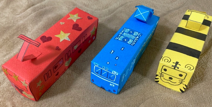 A4サイズの色画用紙にプリントした電車型のペーパークラフトに好きな柄を描いたり、好きなシールを貼ってオリジナルの電車を作ります。