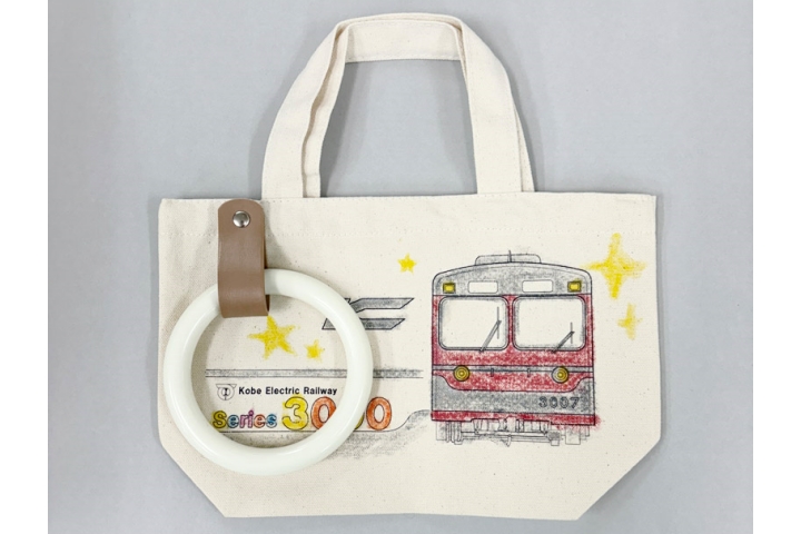 神戸電鉄3000系のイラスト入り「ミニトートバッグ」にクレヨンでぬりえをして、廃材の「つり革」をアクセントに取り付け、オリジナルのトートバッグを作ります。