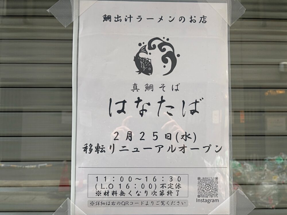 『真鯛そば はなたば』は阪神御影駅の近くで営業していたラーメン店。阪神高架下工事の影響で、昨年の11月に閉店していました。
