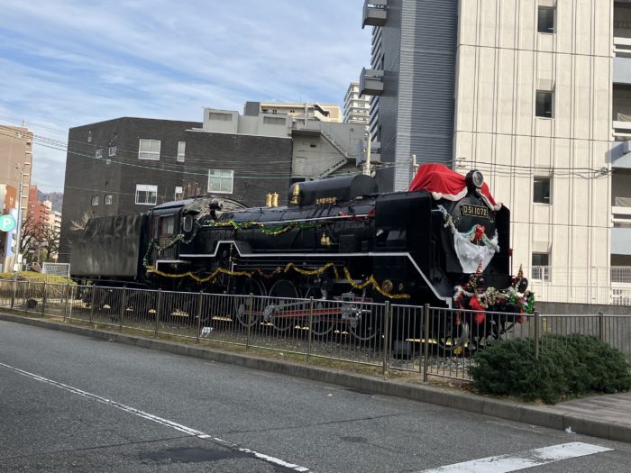 JR神戸駅の東側にある蒸気機関車「D51(デゴイチ)」は、保存活動をしている団体の手によって毎年クリスマス時期にサンタの衣装をまといます。