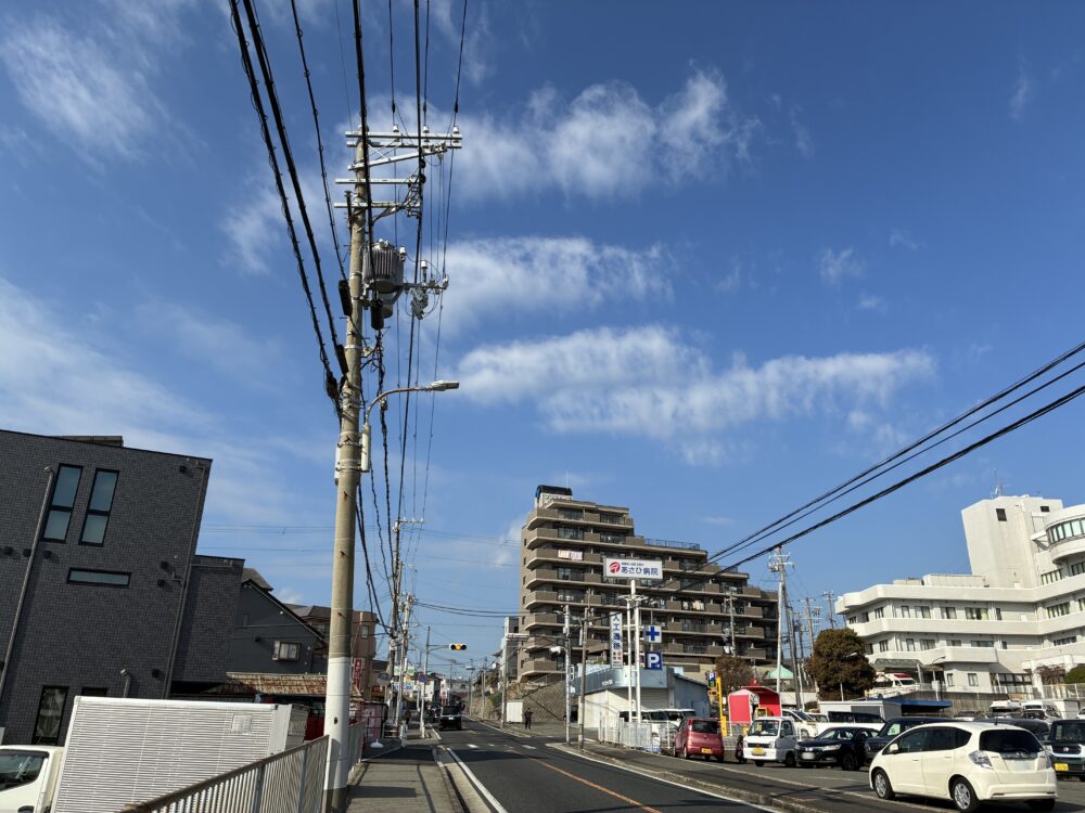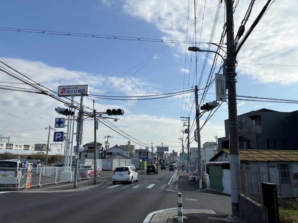 反対を向くとこんな感じ。少し進むと「メモリアルギャラリー タルイ仏壇展示場」や「キリン堂」があり、さらに進むと「日新信用金庫 林崎支店」なども見えます。