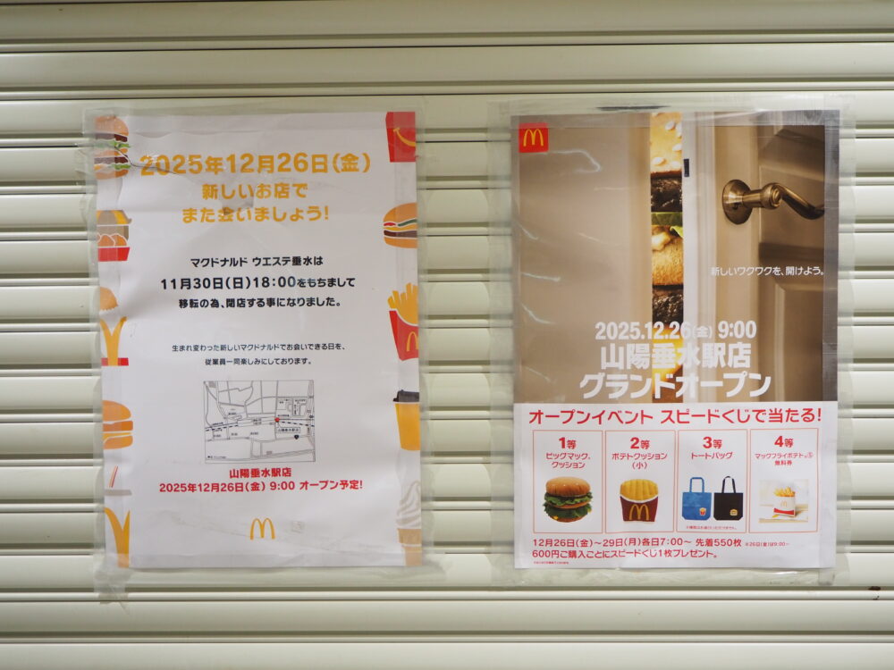 各線垂水駅の西側にある「ウエステ垂水」内のマクドナルドが新店オープンに伴い閉店しています。