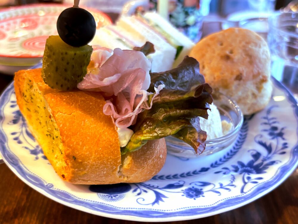 同じお皿には、ニュージーランド産のマヌカハニーが使われた「クロテッドクリーム」や、生ハムがボリューミーな「バケットサンド」なども添えられています。