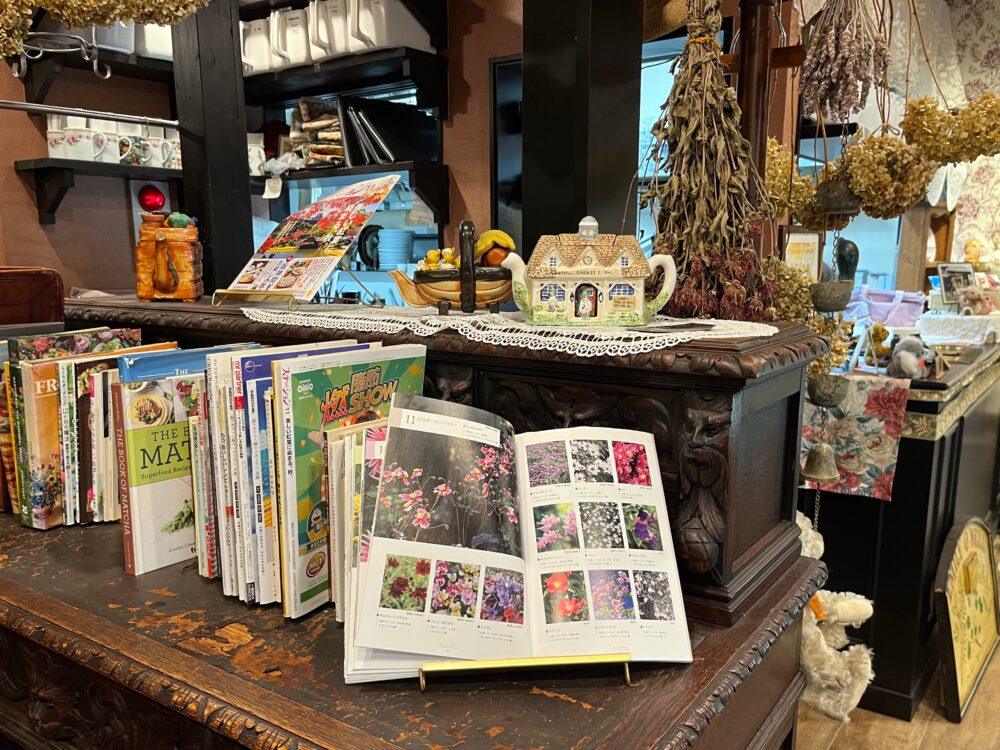 店内には、お花や料理の雑誌やドライフラワーが飾られています。茶器などの雑貨のほか、テディベアも。