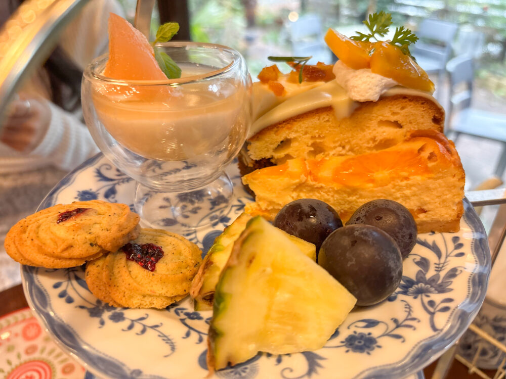 上段にはスイーツやフルーツが盛りだくさん。ジャムがのったしっとりとした「紅茶のクッキー」や、「ケーキ」や「ムース」などがあります。