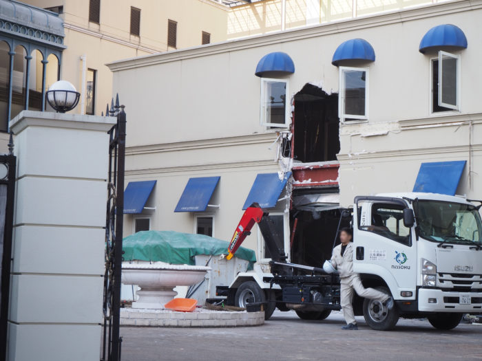 解体は、敷地のモザイク側にある建物から始まってます。重機が入れられ、噴水は上部の石が取り外されていました。