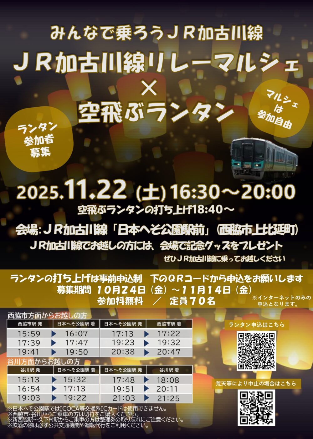 JR加古川線の日本へそ公園駅前で、空飛ぶ「ランタン」を打ち上げる『マルシェイベント』が開催されます。