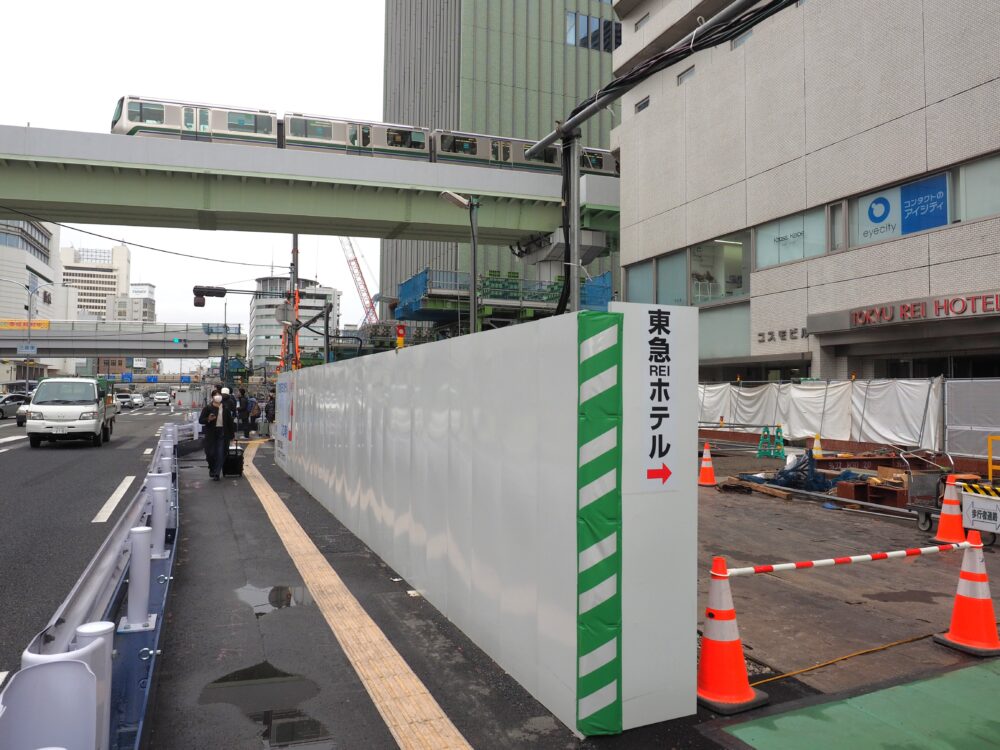 「神戸三宮東急REIホテル」の前は現在再開発の真っ最中。外から少し入口が見つけづらくなっていますが、工事現場の間には通路が設けられており分かりやすく案内の文字も。