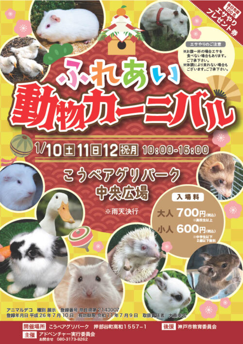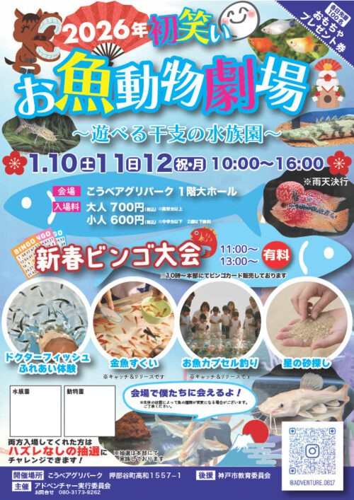 こうべアグリパークで『2026年初笑い お魚動物劇場』が開催されるみたい。「ビンゴ大会」や「エサやり体験」など