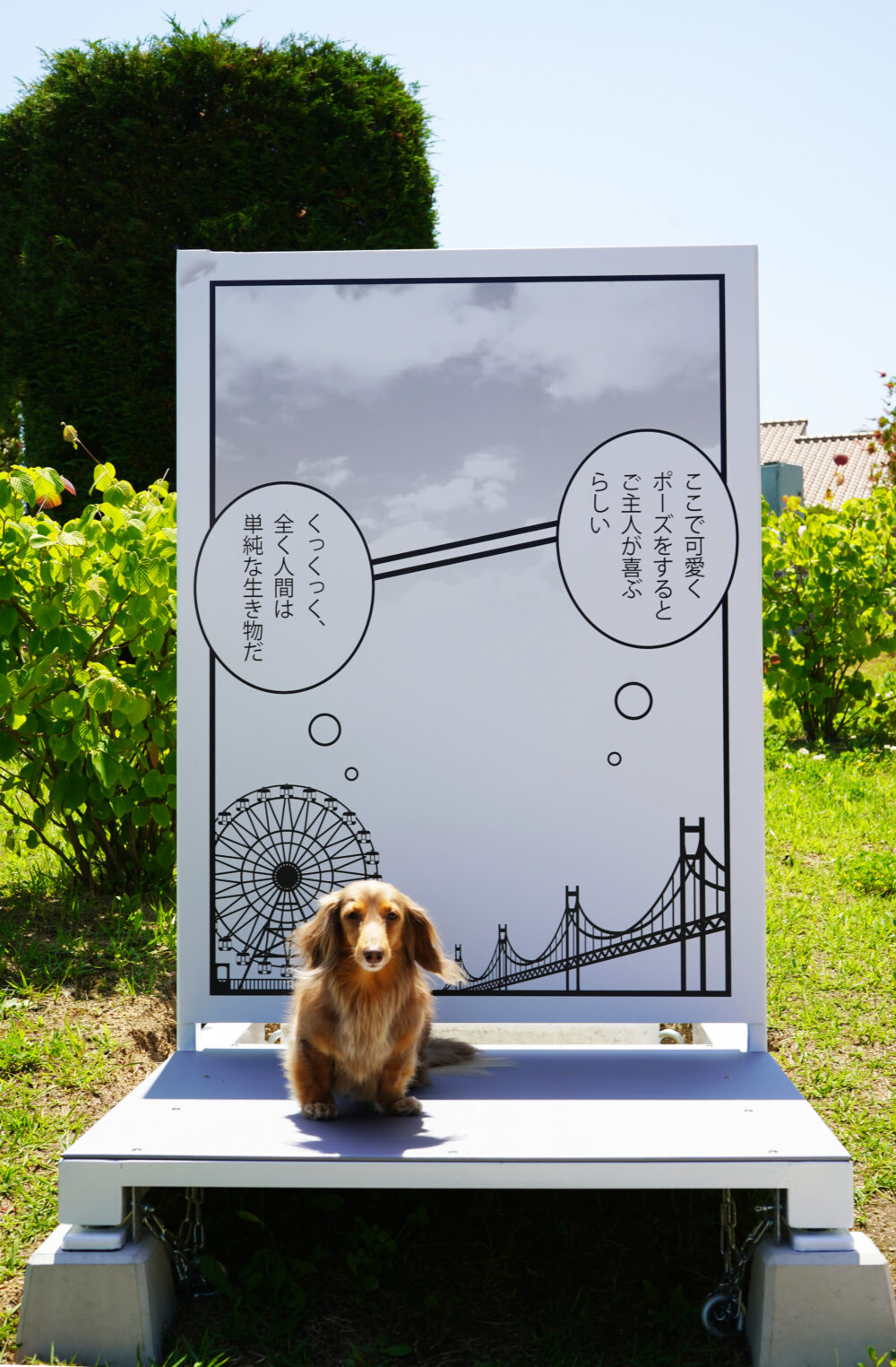 なかには、ワンちゃんが上に乗ることのできる真っ赤なコーヒーカップなんかも。背景には本物の明石海峡大橋や観覧車が写るので、おでかけの良い記念になりそう。