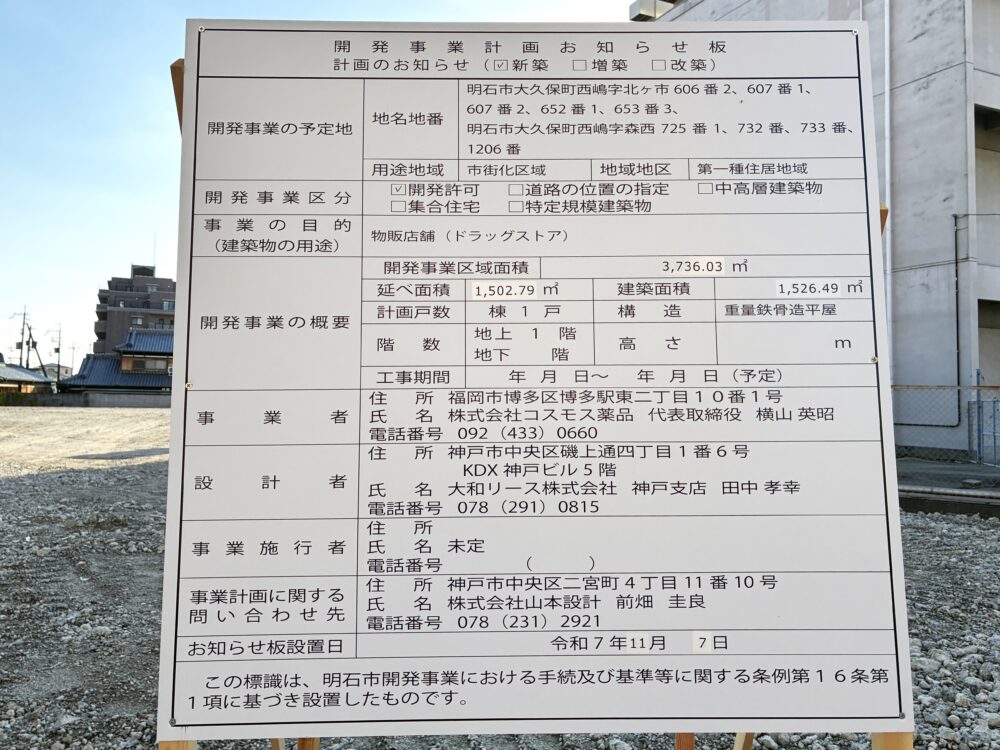明石市・大久保にドラッグストア『コスモス』の新店ができるみたいです。山陽 西江井ヶ島駅まで歩いて5分ほどです。