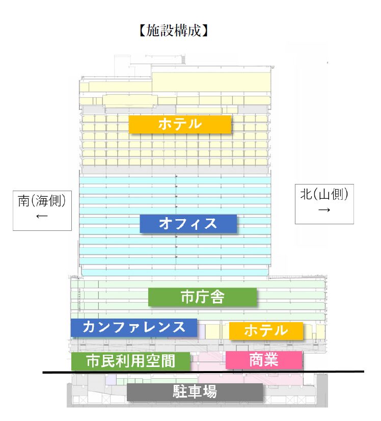 地下2階、地上28階まである高さ約140mの高層ビルで、低層階に「市庁舎」、中層階に「オフィス」、上層階には当初から「国際的ラグジュアリーホテル」の誘致が検討されていました。
