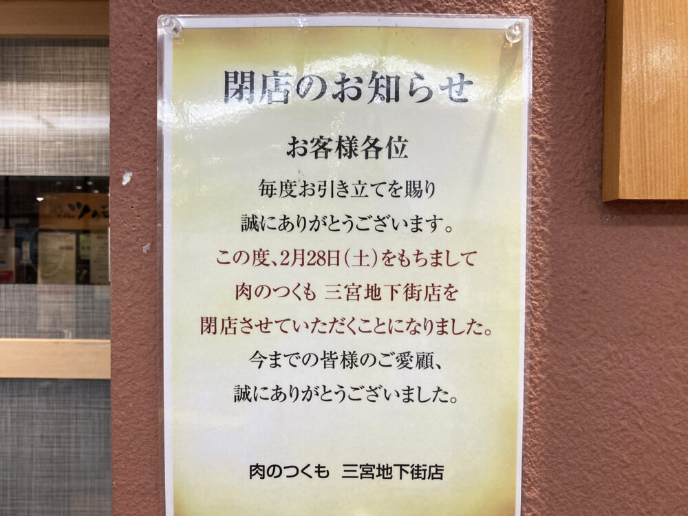 三宮の地下食堂街に並ぶお店が、今月同時に閉店するようです。