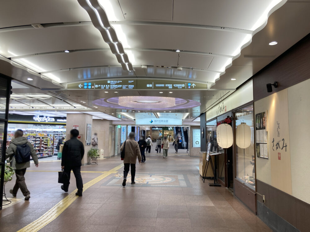 「さんちか」の一番海側のエリアで、東を向くと「神戸国際会館」や去年オープンした「マツモトキヨシ」があります。