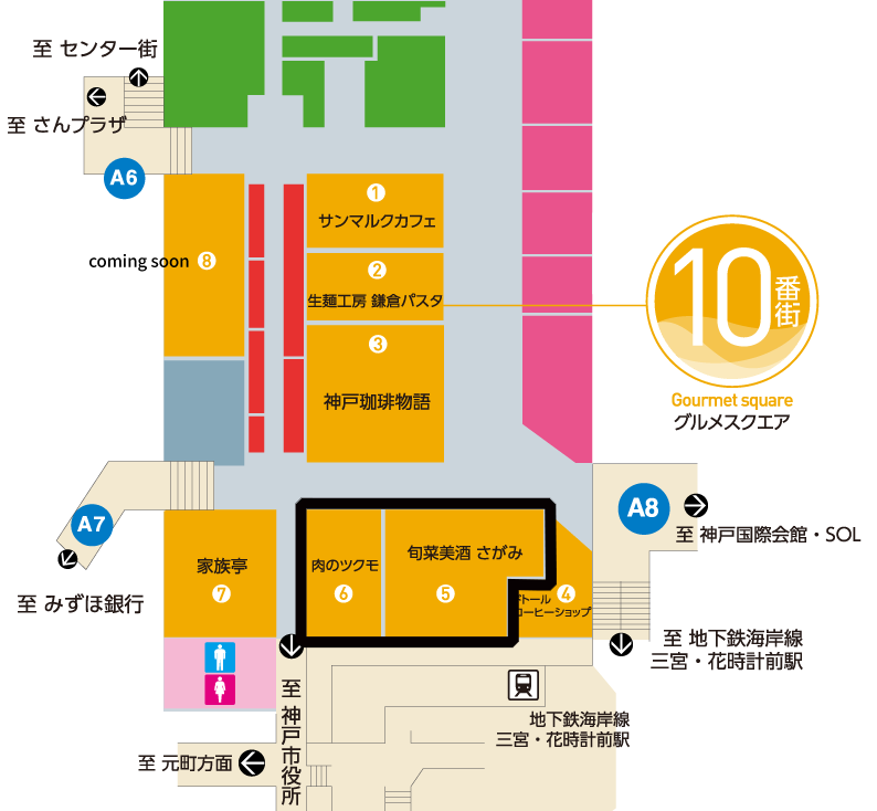 閉店するのは、さんちか10番街の「グルメスクエア」にある『さがみ』と『肉のツクモ』の2店舗です。