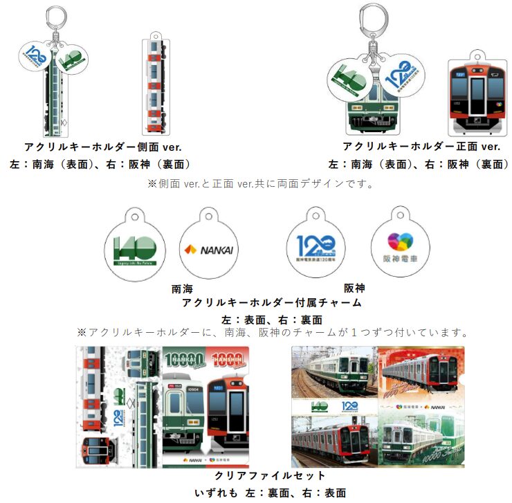 南海は復刻デザイン車両、阪神はRe Vermilion(リ・バーミリオン)をでデザイン。アクリルキーホルダーには、共通してオリジナルチャームが付いてます。