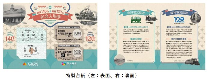 デザインは、南海は現在使用していないC型券に、懐かしい地模様つき。阪神は、裏面に開業当時の乗車券を再現したレプリカデザインを採用しているそう。