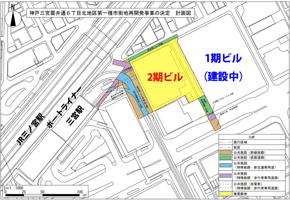現在建設中の「1期ビル」は高さ163mで、「バスターミナル」や「三宮図書館」が入る計画です。