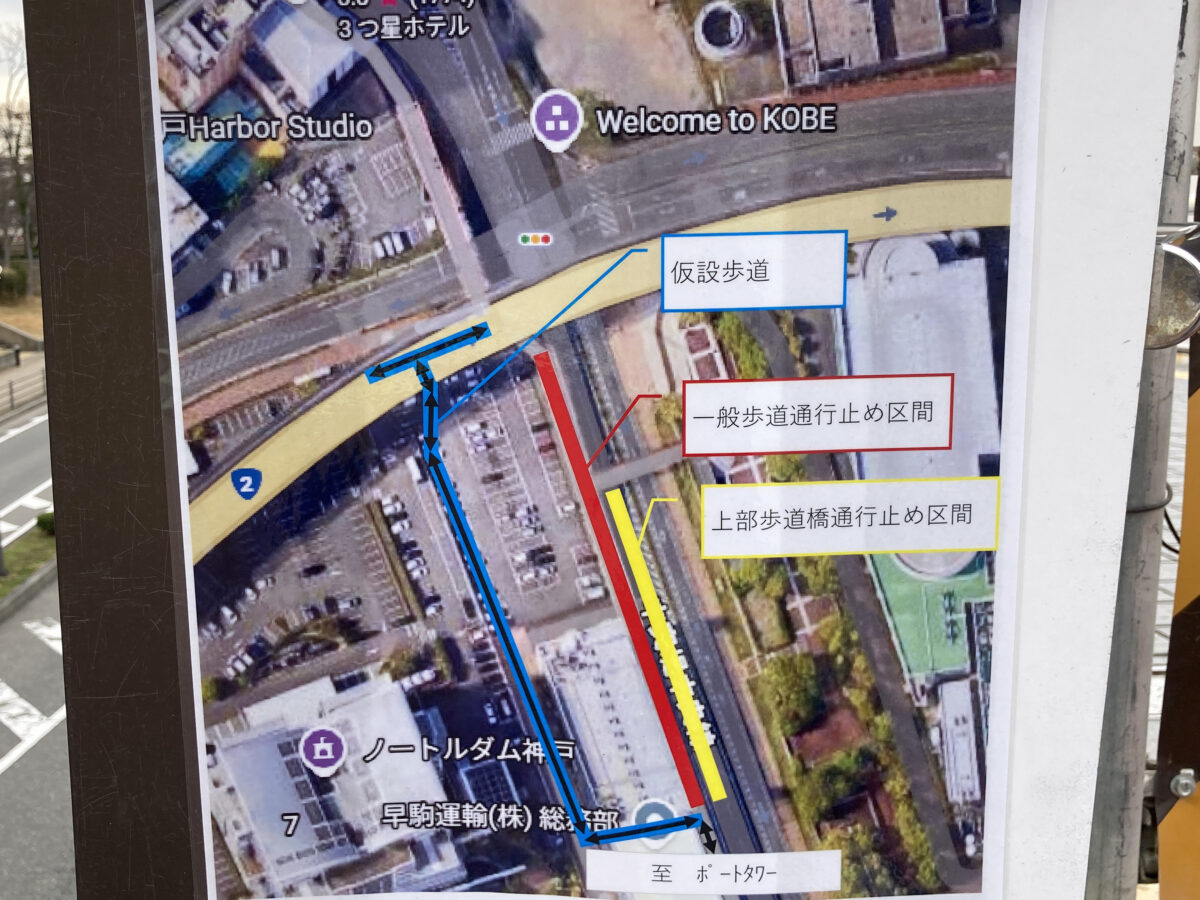 「通行止め」になっているのは、元町方面とメリケンパークをつなぐ「歩道橋」の一部。