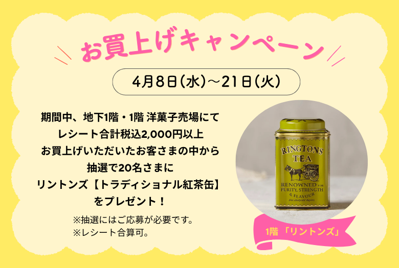 期間中、阪神梅田本店 地下1階・1階 洋菓子売場でレシート合計「税込2,000円」以上購入した人の中から、抽選で20名にリントンズの『トラディショナル紅茶缶』がプレゼントされるみたい。