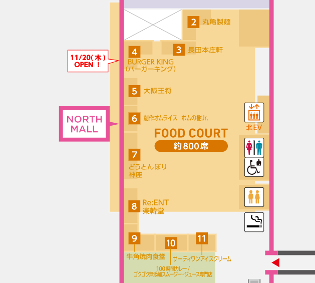 アメリカ発のハンバーガーチェーン『バーガーキング』がオープンするのは、ノースモール4階の「フードコート」の一角。