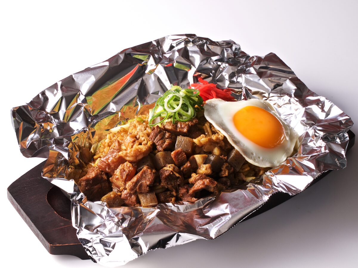 自家製麺を鉄板の上で細かく刻み、ごはんと名物のぼかっけを甘辛いソースで合わせたボリュームのある一品です。