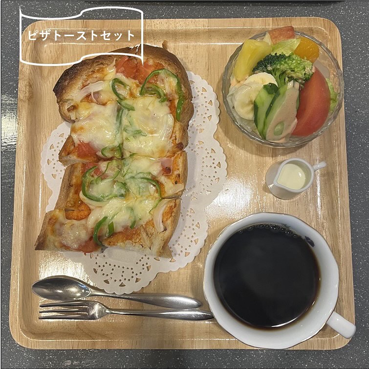 こちらは人気の「ピザトーストセット(920円)」。モーニングセットの食パンより厚切りのものが使われていて、もちもちふわふわの食感が楽しめるみたい。※価格は2025年3月時点のもの