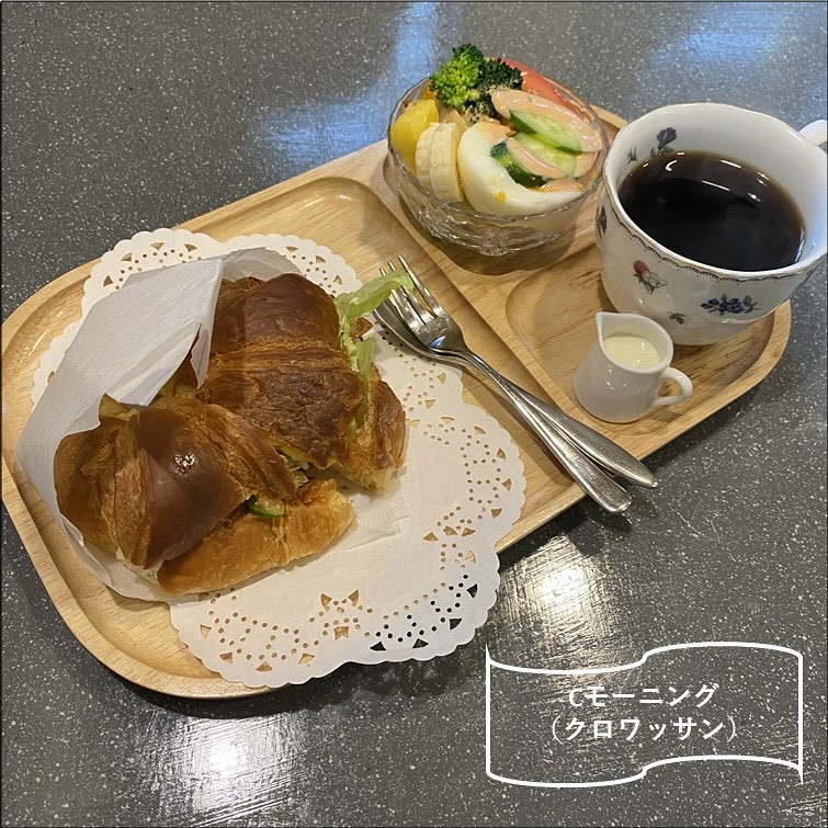 11時まで提供されてる「モーニングセット(500~650円)」には、サンドイッチやトーストなどの好きなパンに、サラダとコーヒーが付いてきます。サラダにフルーツが入ってるのも、ちょっとうれしいポイント。※価格は2025年3月時点のもの
