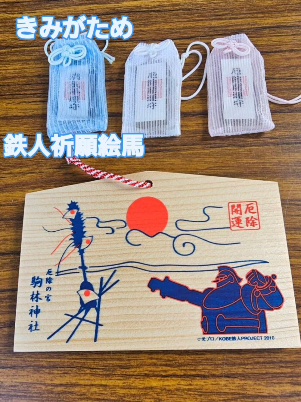 「鉄人28号」のイラストが描かれた絵馬は、この場所ならではの授与品です。ちなみに絵馬の左側に描かれてるのは「左義長(さぎちょう)」といって、かつて長田港ではこの「左義長」をぶつけ合って漁場争いをしていたんですって。