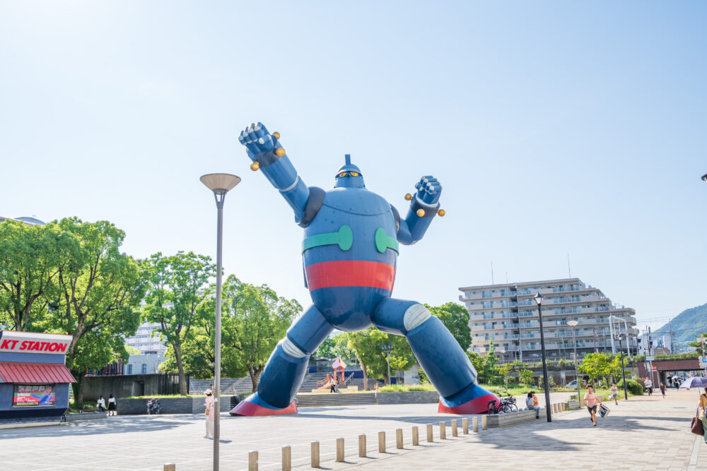 JR新長田駅から南側に3分ほど歩くと、巨大なロボットの姿が見えてきます。こちらは、神戸出身のマンガ家・横山光輝さんの代表作「鉄人28号」の主人公ロボットを再現したモニュメントです。