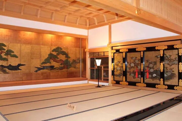 最も格式の高い部屋とされる「上段の間」の壁面には、当時の雰囲気を再現するために、江戸時代初期の狩野派絵師が描いた屏風絵が転用されてます。