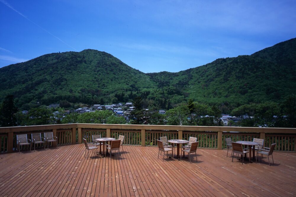 エントランス棟2階にある展望デッキは、和田寺山をバックに登り窯の窯元群が並ぶ「丹波焼の里」の全景が見渡せますよ。