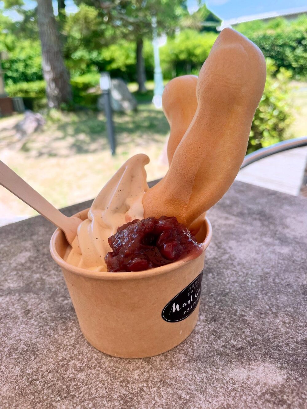 こちらの「えだまめ最中ぱふぇ」は、黒豆ソフトクリームに、大きな枝豆型の最中(もなか)+丹波篠山の老舗和菓子店「梅角堂」のあんこをトッピングした商品。インパクト大で、写真映えもバッチリです。