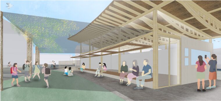 材木町の歴史を感じる丸太と地元の漁師網を活用した日除を設け、風が通り抜ける心地の良い屋外空間が作られます。