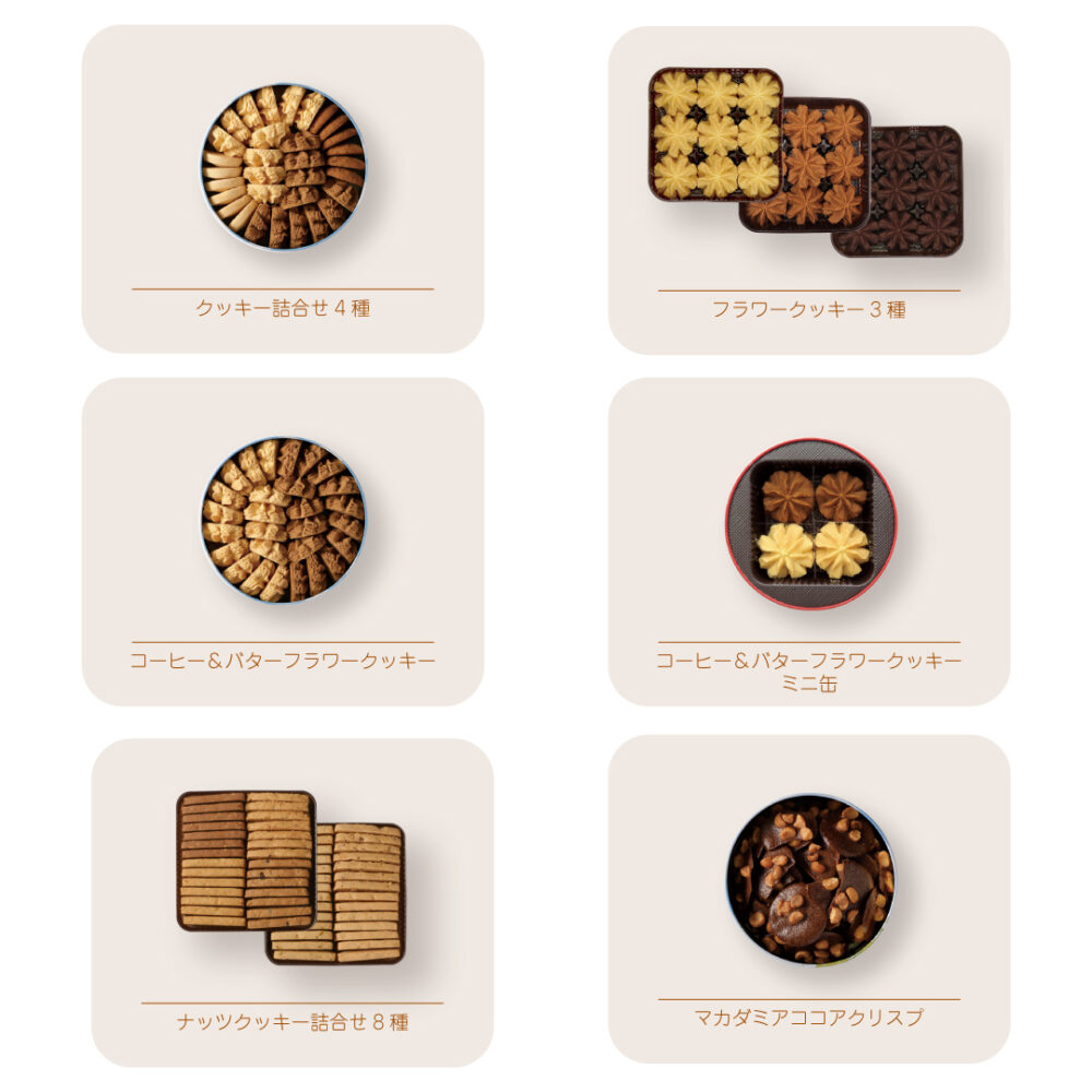 今回販売されるのは、クッキー詰合せ4種/フラワークッキー3種/コーヒー&バターフラワークッキー/コーヒー&バターフラワークッキーミニ缶/ナッツクッキー詰合せ8種/マカダミアココアクリスプの全6種類。
