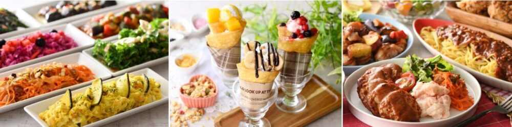 色鮮やかな「デリ」やカラッとジューシーな「自家製から揚げ」、トッピングなど自分好みの味で食べられる麺類、ソフトクリームといったデザートなどバラエティー豊かなメニューを食べ放題で楽しめる「ニラックスブッフェ」。