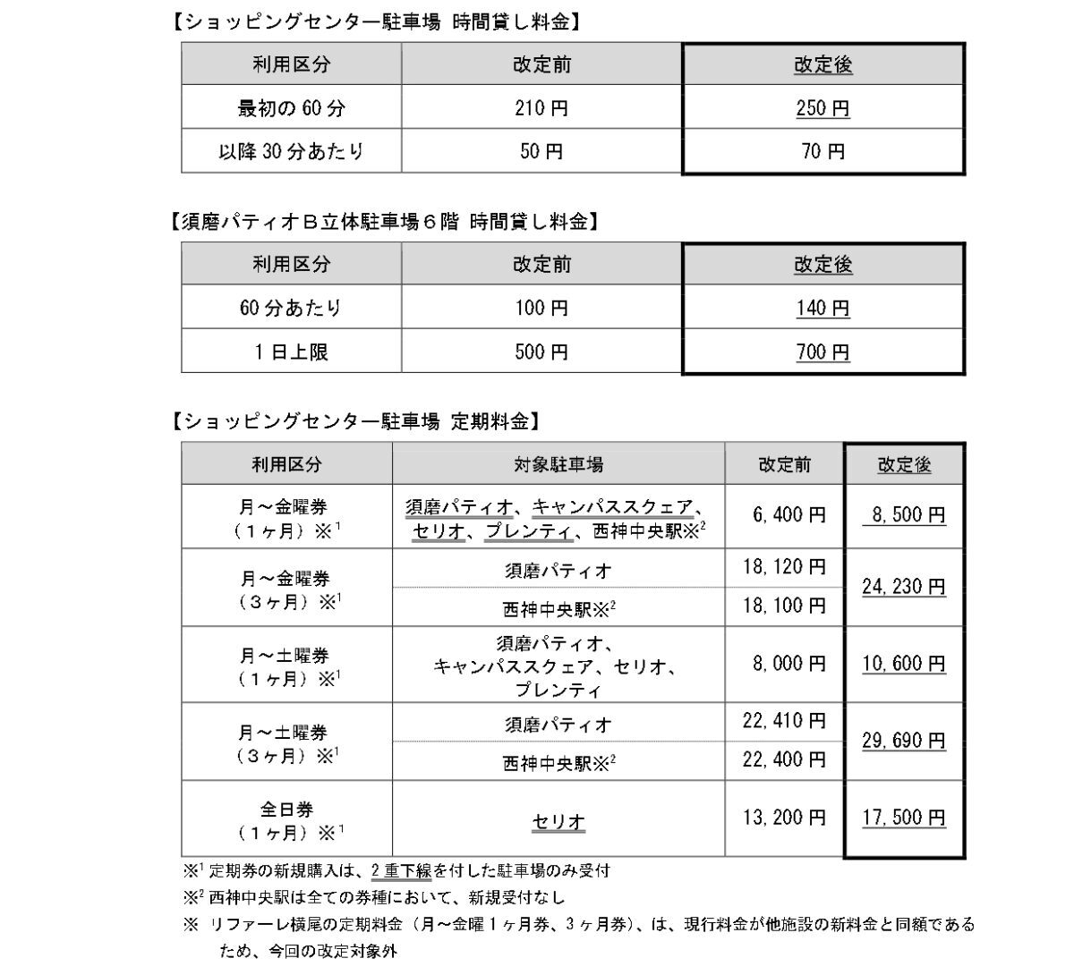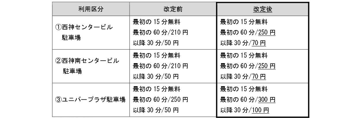 地下鉄駅前の5つの商業施設(リファーレ横尾・須磨パティオ・キャンパススクェア・セリオ・プレンティ)および西神中央駅駐車場を含む計6駐車場については、以下のように改定されます。