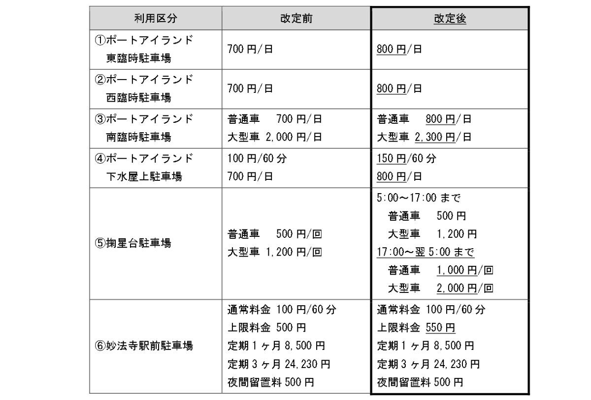 その他、以下の駐車場も料金改定が行われます。(料金は全て税込表示)